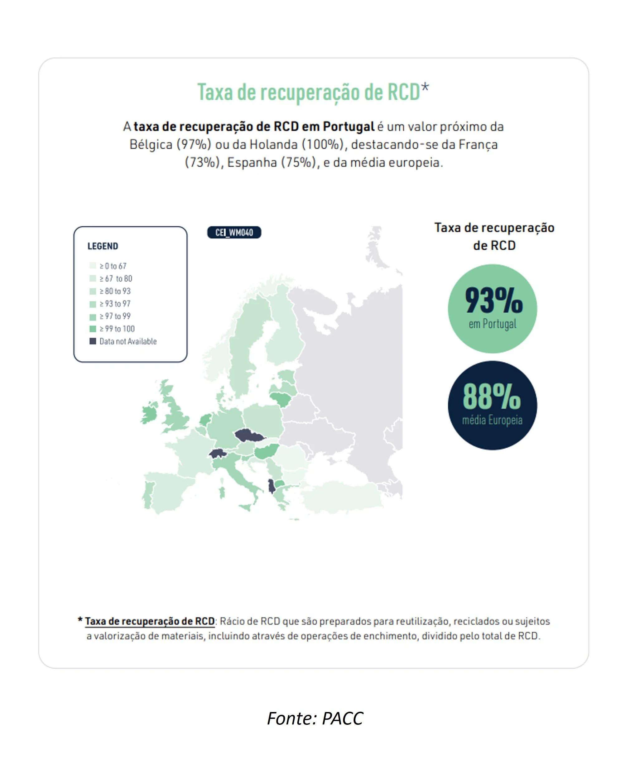 Serve para monitorizar os progressos na área da ‘gestão de resíduos’. Portugal apresenta valores elevados para a Taxa de recuperação de RCD com cerca de 93%, um valor próximo da Bélgica (97%) ou da Holanda (100%), destacando-se da França (73%), Espanha (75%), e da média europeia (88%).